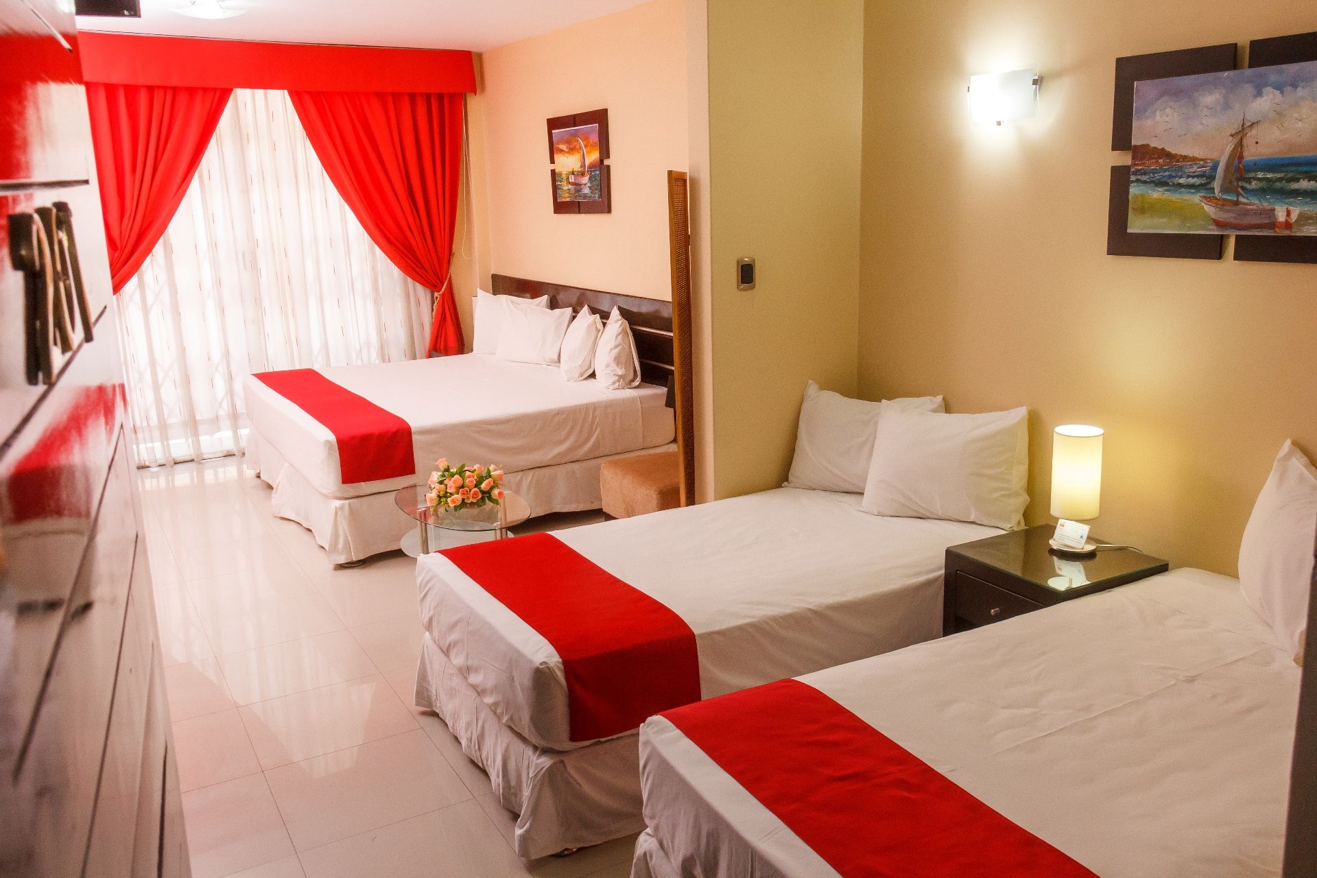 Amplia habitación elegantemente diseñada en pasillo conformada con una cama King Size y dos camas Twins o cuatro camas Twins; cuenta con área de trabajo que incluye escritorio ejecutivo y útiles de oficina, balcón, aire acondicionado, frigobar, televisor LCD 32” con cable, agua caliente, amplio closet, incluye cuatro desayunos.