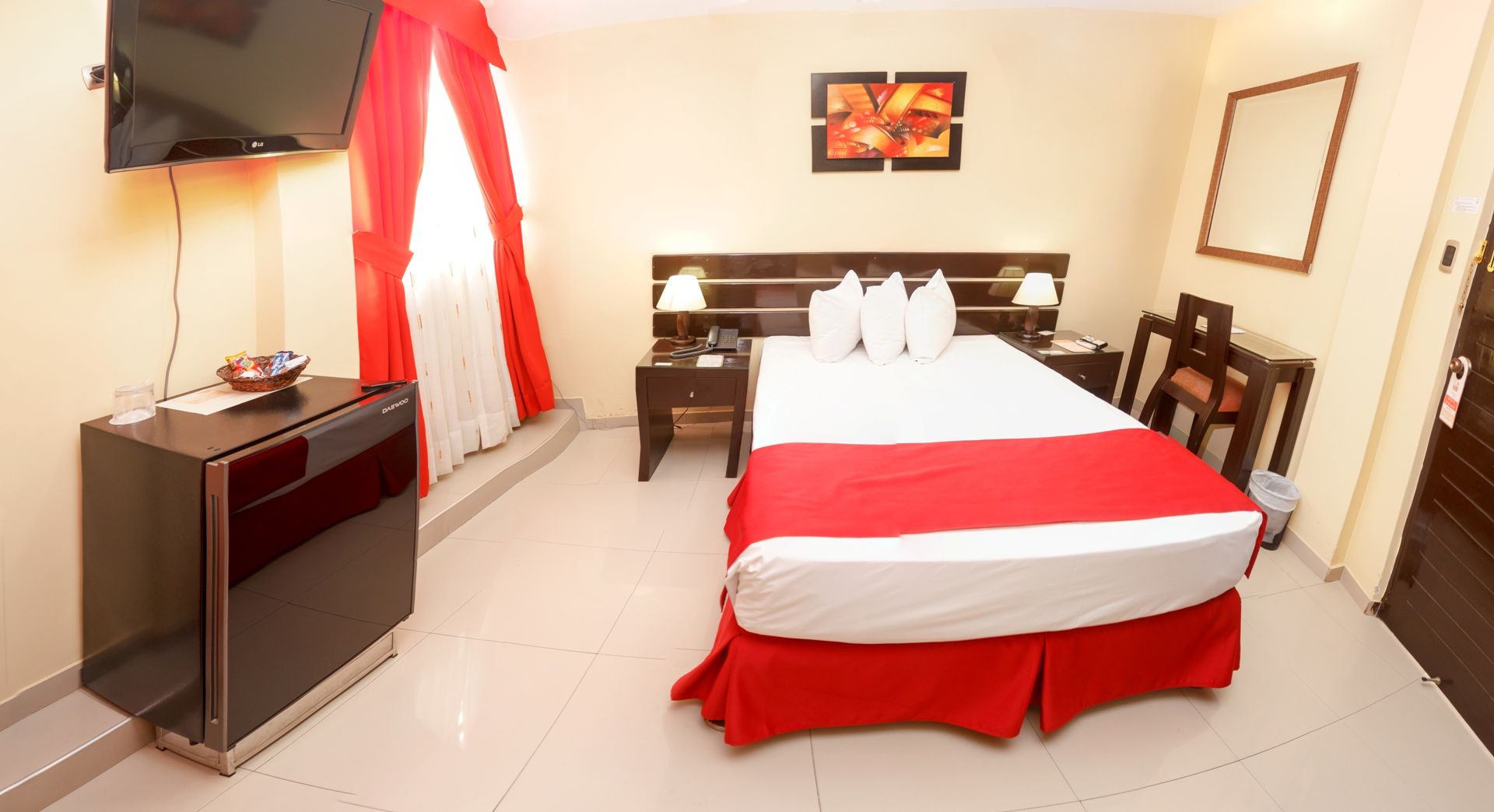 Cómodas y amplias habitaciones con cama 2 plazas y King Size, aire acondicionado con control individual, friobar, conexión a Internet Wi-Fi, Televisor LCD 32” con cable, agua caliente, mesa de trabajo, closet, incluye desayuno.
